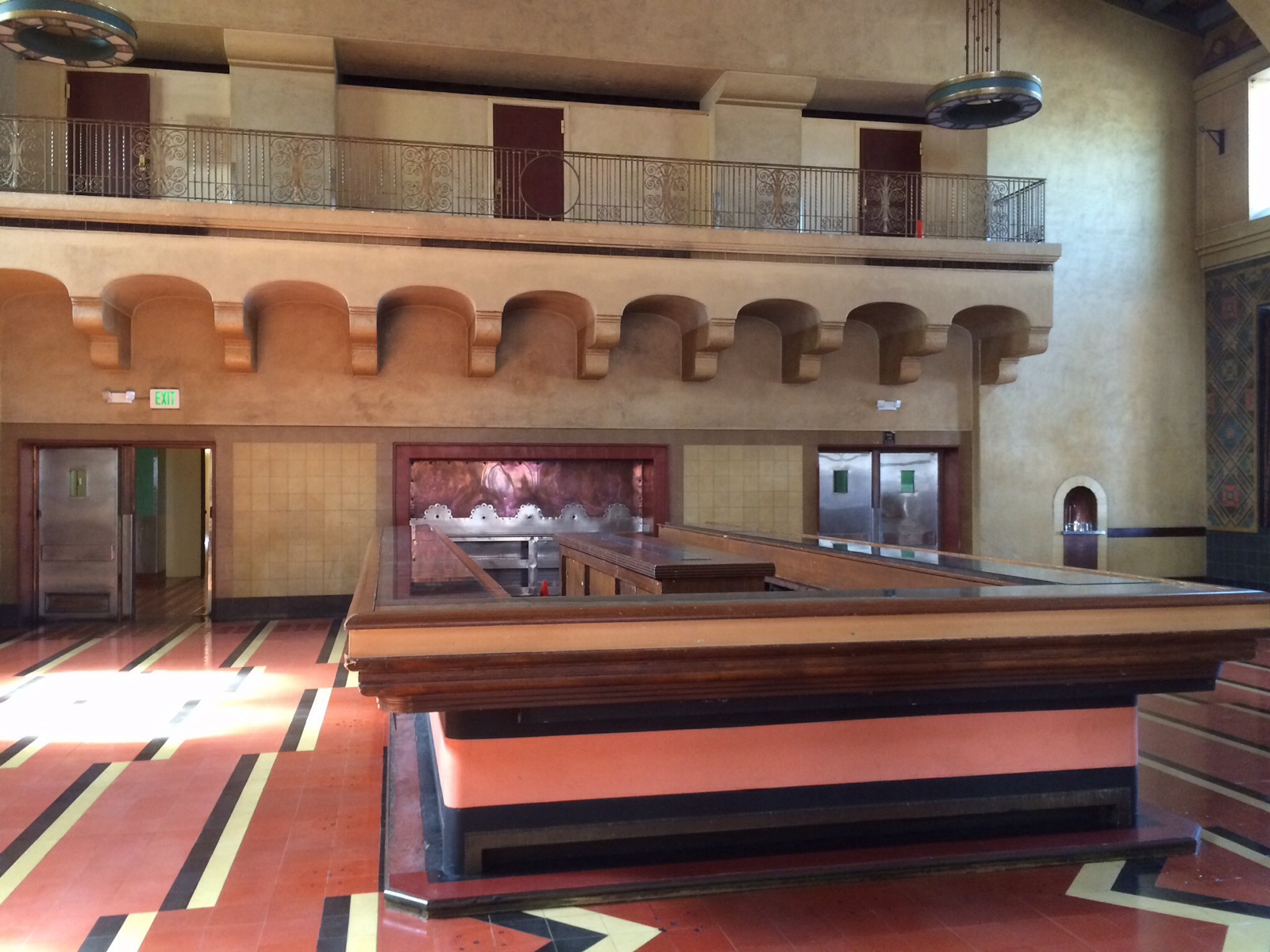 We visited what was once the main restaurant at the station. The restaurant was run by Fred Harvey. Fred Harvey was an entrepreneur who had developed many restaurants for the Atchison, Topeka and Santa Fe Railroad. These were among first instances of chain restaurants across the USA. Currently the restaurant has no fixtures, but you can imagine the grandeur that was once there. Notice the marble floors and the wrap-around bar. We were told that the area is available for rental for special functions (weddings, galas and such).