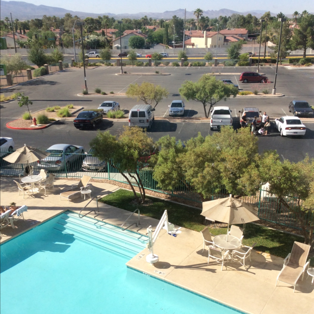 Did I tell you that it is hot here in the desert? The thermometer in the car read 104 when we arrived yesterday afternoon. Peaked out at 109 driving through the desert north of Las Vegas. We have a room overlooking the pool. No one using it. Too hot.