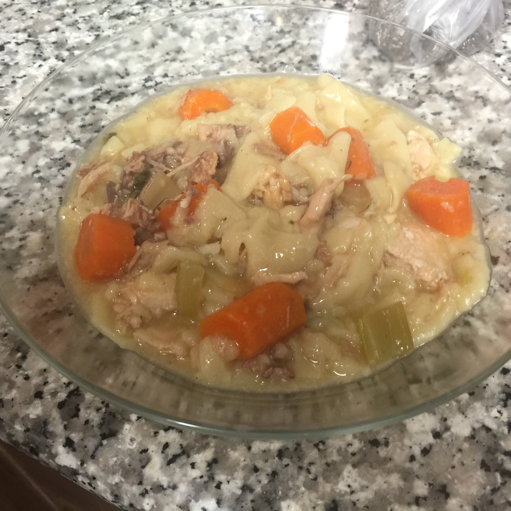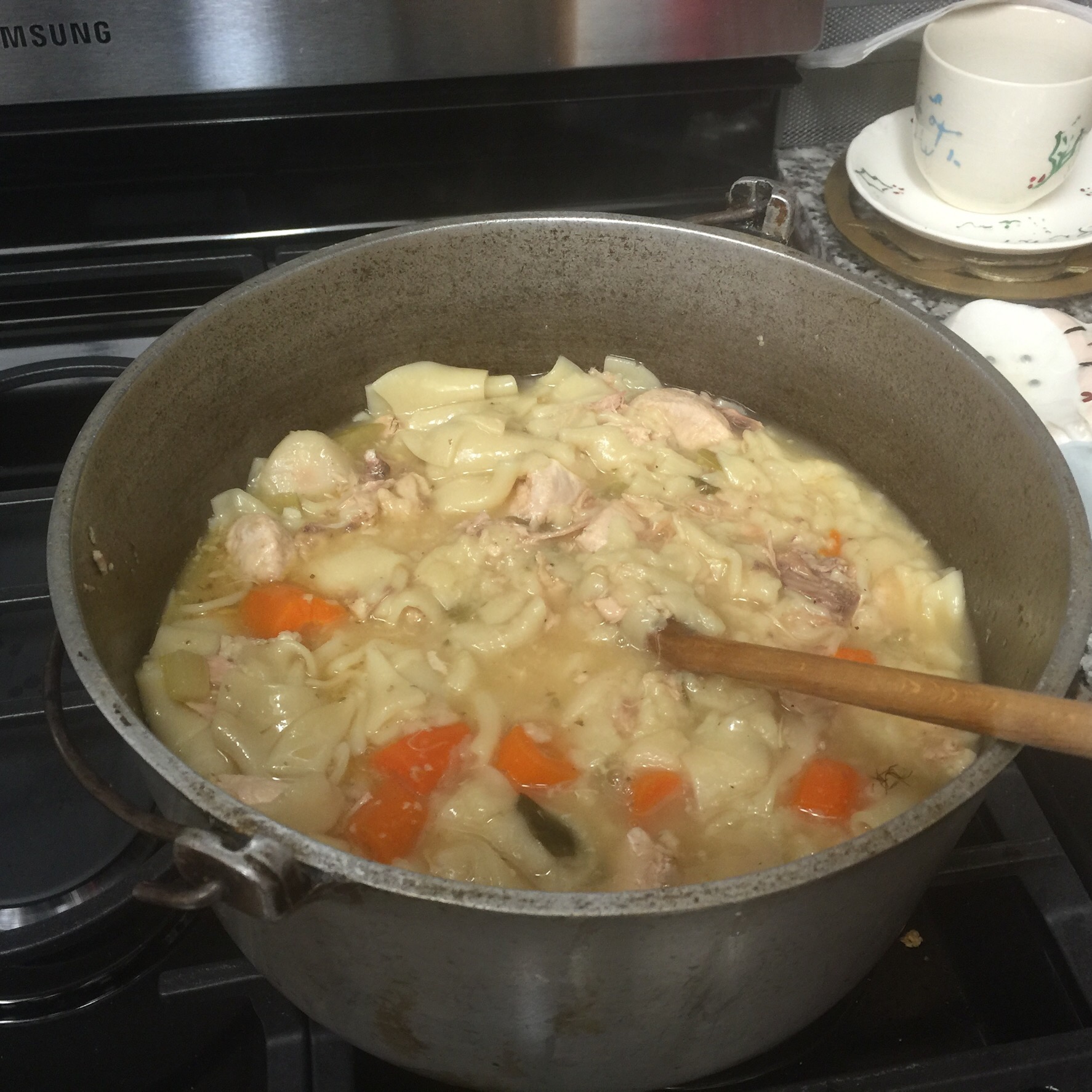 Return the chicken to the pot. Add 1c of carrots and 1 c of celery to the pot. I like to add noodles to the mix. I cook 8 oz. of noodles for about 10 minutes. Drain and add to the pot. Add whatever vegetables you like. Perhaps, peas, maybe corn. Some folks prefer rice to noodles. In that case add about 1 cup of uncooked rice to the pot.