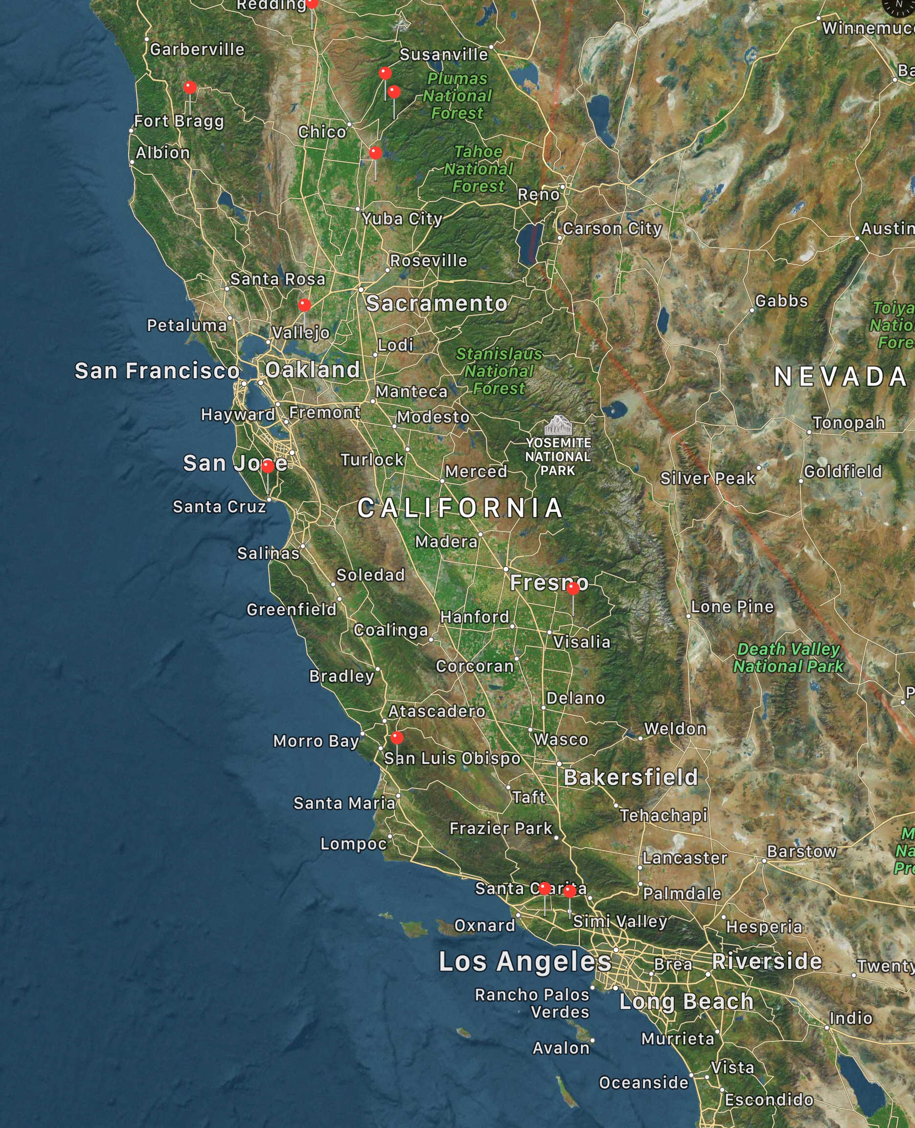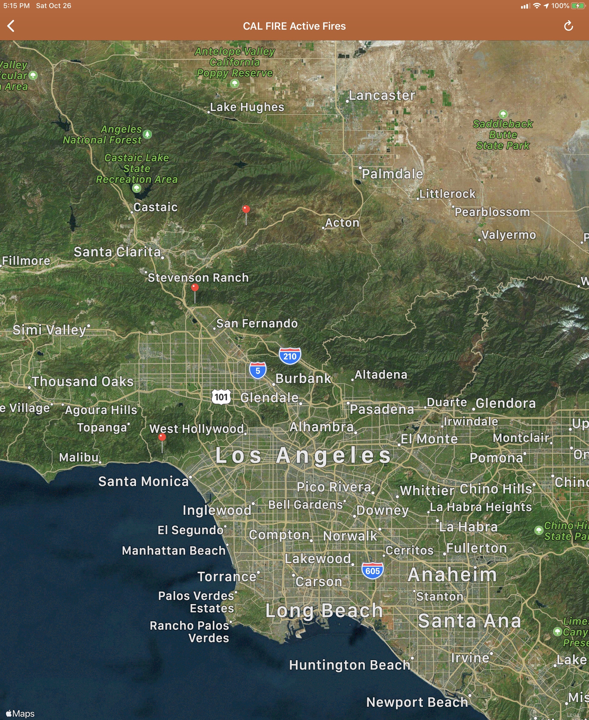 You know that you live in California, when you have an app on your phone that shows the current fire “map”. By the way, the app is free. Here’s the current fire map of California. Note, the two red dots just north of LA. These are the two fires that are near us.